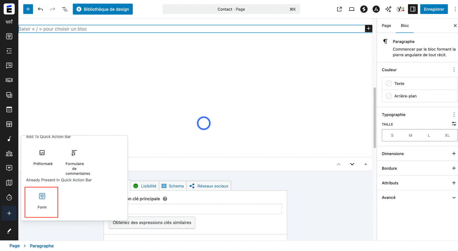 Une fois placé, le formulaire de base apparaît immédiatement sur la page, prêt à être configuré.
