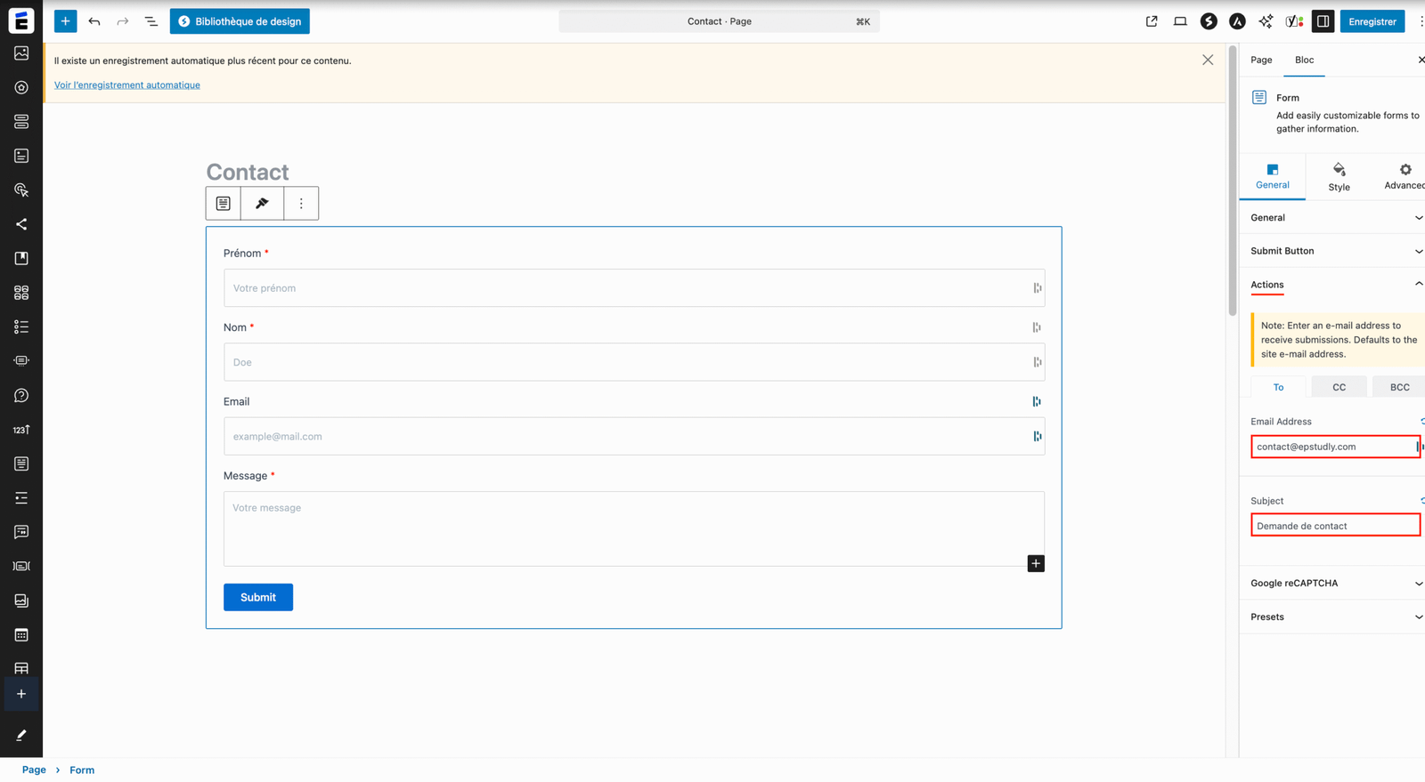 - Définissez un objet d’email clair (ex. : “Demande de contact via le site”).