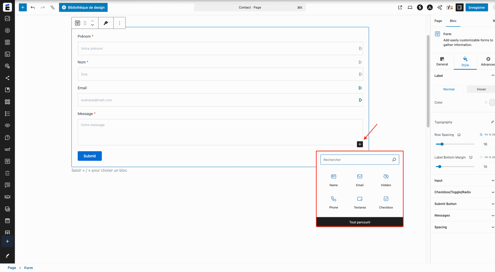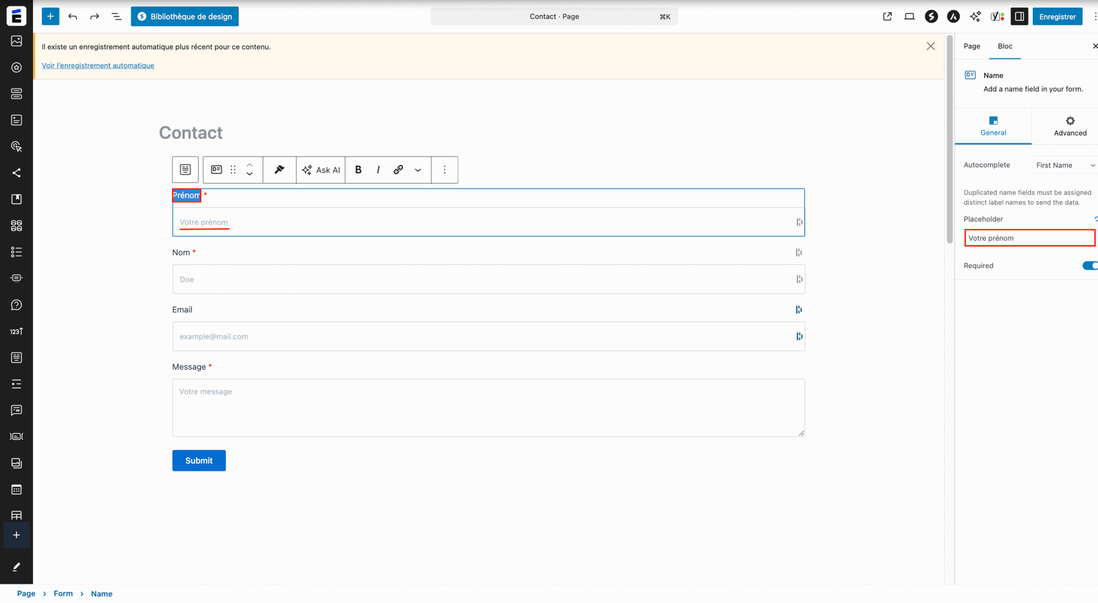 Il est important d’adapter les libellés et placeholders pour correspondre au vocabulaire attendu par vos visiteurs. Par défaut, certains champs sont en anglais (“John”, “Message”).