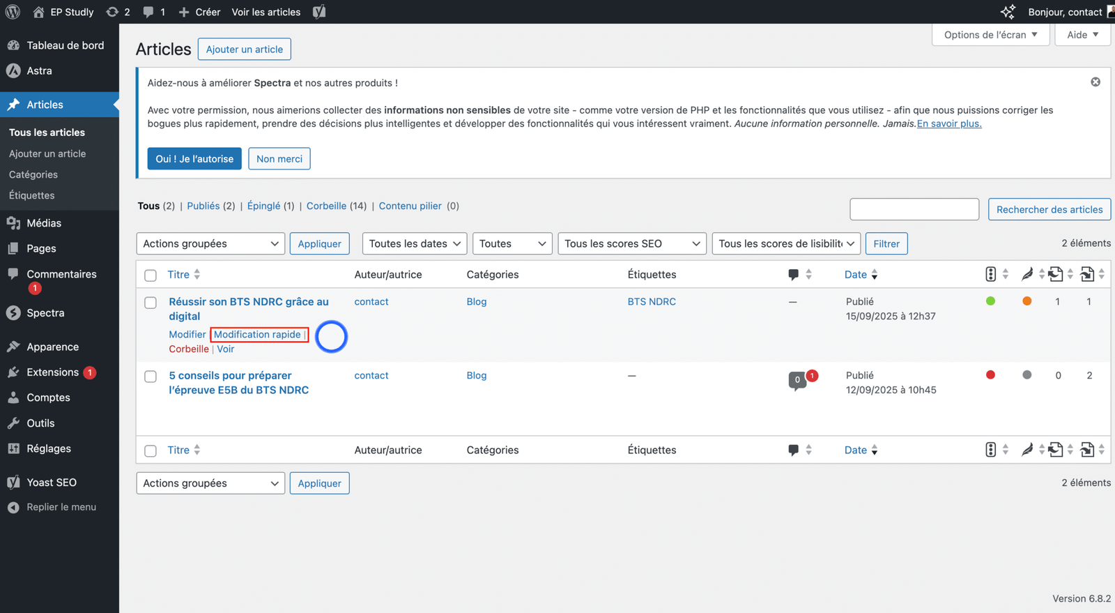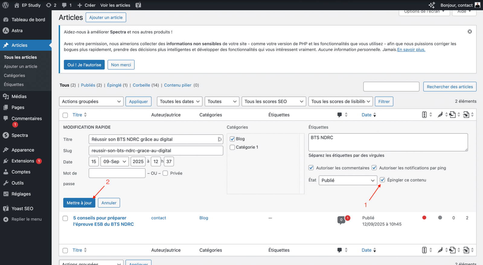 👉 Cette fonctionnalité permet de garder un contenu prioritaire (ex. : “5 conseils pour réussir l’épreuve E5B”) en haut de la liste des articles, même si d’autres articles plus récents sont publiés.